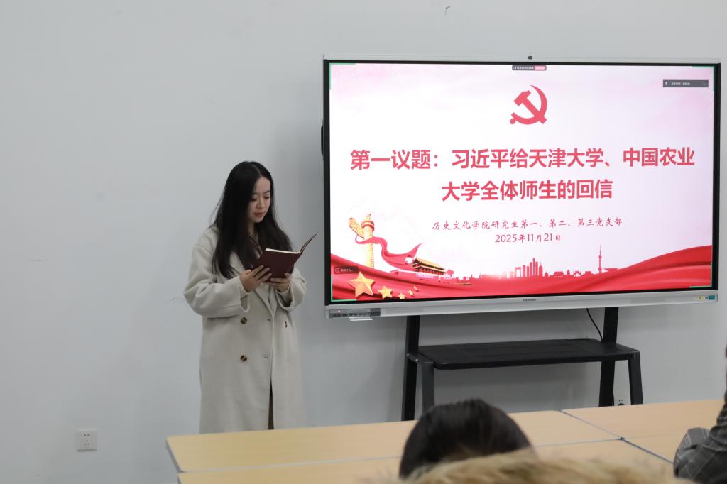 2025年11月21日下午,我院研究生第一、第二、第三党支部在孔子书院B106教室联合开展11月份主题党日活动,研究生党支部全体党员通过线上线下相结合的方式参加会议。会议由研究生第一党支部书记孙锋主持。