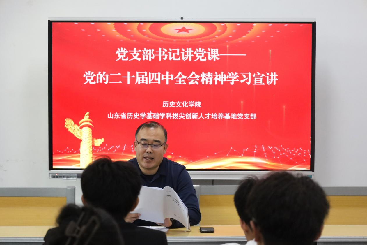 11月28日下午,我院山东省历史学基础学科拔尖创新人才培养基地党支部在孔子书院B106教室开展学习贯彻党的二十届四中全会精神宣讲暨十一月主题党日活动,党支部书记王建阳为党支部全体党员开展精神宣讲,党支部副书记闫浩主持。