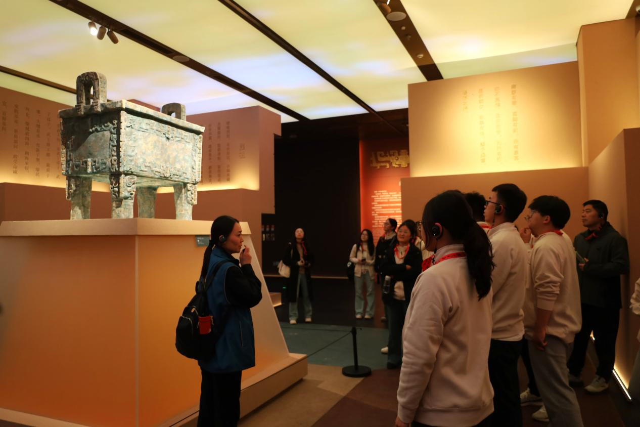 在研学导师的带领下,学生们首先深入了解了甲骨文的发现与研究历程,观摩了甲骨文碑林、甲骨窖穴等遗迹相关展陈,知晓了甲骨文中记载的商王朝政治、经济、文化等方面的重要信息。随后,研学导师带领学生们依次观摩了展厅中的司母戊鼎(复制品)、妇好鸮尊等代表性青铜器,以及精美的玉器、陶器等出土文物,深入探究了商代的手工业水平与艺术审美。最后,学生们重点学习了甲骨文中关于商代祭祀、战争、农业等内容的记载,对商王朝的社会风貌有了更具象的认知。在参观学习过程中,学生们积极向研学导师请教相关问题,师生互动气氛活跃。