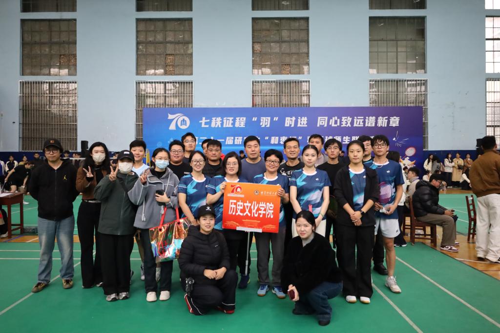 “七秩征程‘羽’时进,同心致远谱新章”,10月24日至26日, 第二十一届研究生“和衷杯”羽毛球师生联谊赛(曲阜校区)在体育科学学院球类馆隆重举行。本次比赛由曲阜师范大学校团委、研究生处、学工处主办,体育学部、教职工羽毛球协会协办,共计15支队伍参赛。我院派出以党委书记姜开勇为领队、副院长王京传为教练的参赛队伍。参赛队员有王建阳、吕厚轩、张亚宁、张文华、陈德洋、孟凡礼、孙锋等老师和闫齐麟、李子昕、任洁、王晓彤、张依依、王雨荷、龙子翔等同学。