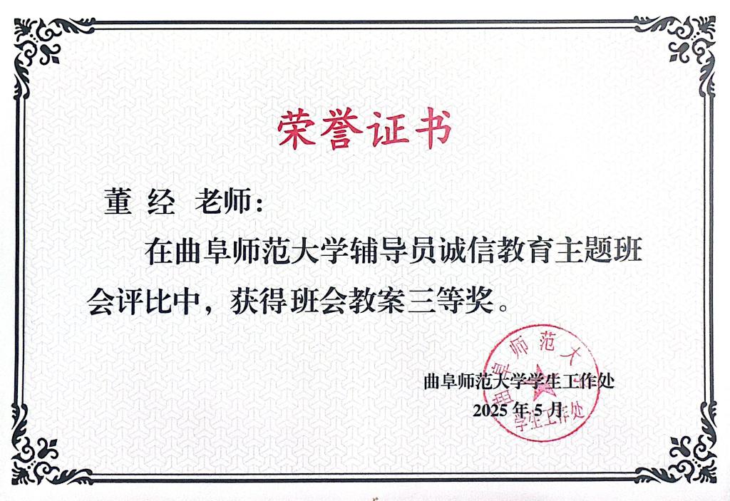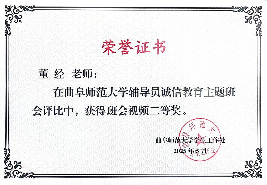 近日,我校举办的辅导员诚信主题教育班会评比活动顺利落下帷幕。我院辅导员积极响应、广泛参与。董经老师获得班会视频二等奖和班会教案三等奖的成绩。