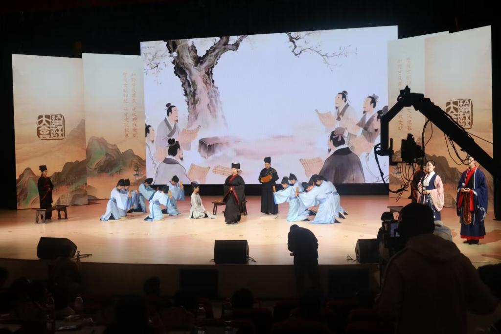 比赛过程中,我院学子展现出扎实的经典素养与生动的诠释能力。在“了如指掌”和“当仁不让”两个环节中,由窦衍洁、林亚蕊、朱韬伊三名同学组成的代表队引经据典、踊跃抢答,以扎实的学识和清晰的逻辑赢得了两个环节的最高分。在“游于艺”环节中,21名同学倾情演绎情景剧《贫而非窘》,生动塑造了子贡“贫而无谄”的君子形象,并庄重还原古代拜师场景,深刻诠释了“礼之用,和为贵”的文化内涵。整场表演编排精巧、情感真挚,赢得现场评委与观众的一致好评。